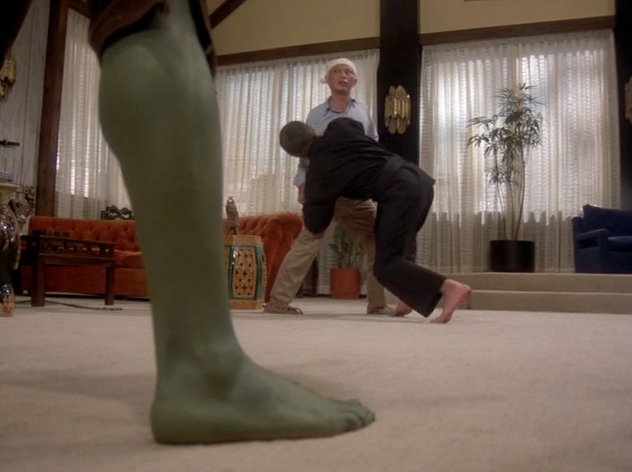 Hulk-Out #2: David transforms and, with his hands tied to the bed frame, the frame splinters as his clothes rip. Gramma Loo was discarding of a broken tea cup, but when she returns to find her furniture smashed, David gone, and a large topless green man climbing out her window she starts to scream and slap Hulk with a fan. It’s the Chinese stereotype combined with the funny grandma stereotype, and it actually could have been funny if Ferrigno had given a good reaction. As it is Hulk gives Gramma Loo a look and just shakes his head “no.” Hulk climbs out the window to go save Li Sung and runs through the backlot, roaring at locals and flipping furniture.